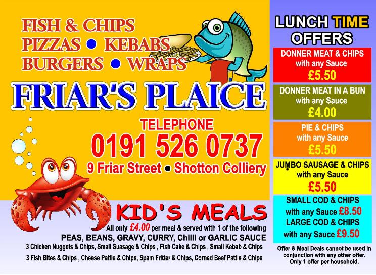 Located at 9 Friar St, Shotton Colliery, Friar's Plaice stands as a community favorite. This fish and chips establishment thrives on local patrons who appreciate quality and affordability. The casual vibe encourages a friendly dining experience, where customers often share a laugh with the welcoming staff. Shotton Colliery offers ample free street parking, making it convenient for those eager to enjoy a hearty meal. Operating daily, Friar's Plaice caters specifically to lunch crowds, paving the way for a quick snack break or a relaxed meal with family and friends after a long day. The establishment prioritizes accessibility with wheelchair-friendly seating arrangements. With dedicated amenities like a clean toilet for patrons, it ensures comfort during visits. The local charm of this area resonates within the walls of Friar's Plaice, making it not just a meal stop but a place where community and quality converge.